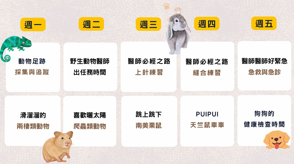 帶領孩子學習特殊寵物專業知識(非犬貓寵物之常見疾病、臨床疾病特徵)、犬貓營養學(動物生病或特殊情況的營養須知)、獸醫師臨床診療方法等全方面知識,深入淺出的教學方法讓學童能快速吸收,成為獸醫小達人。
